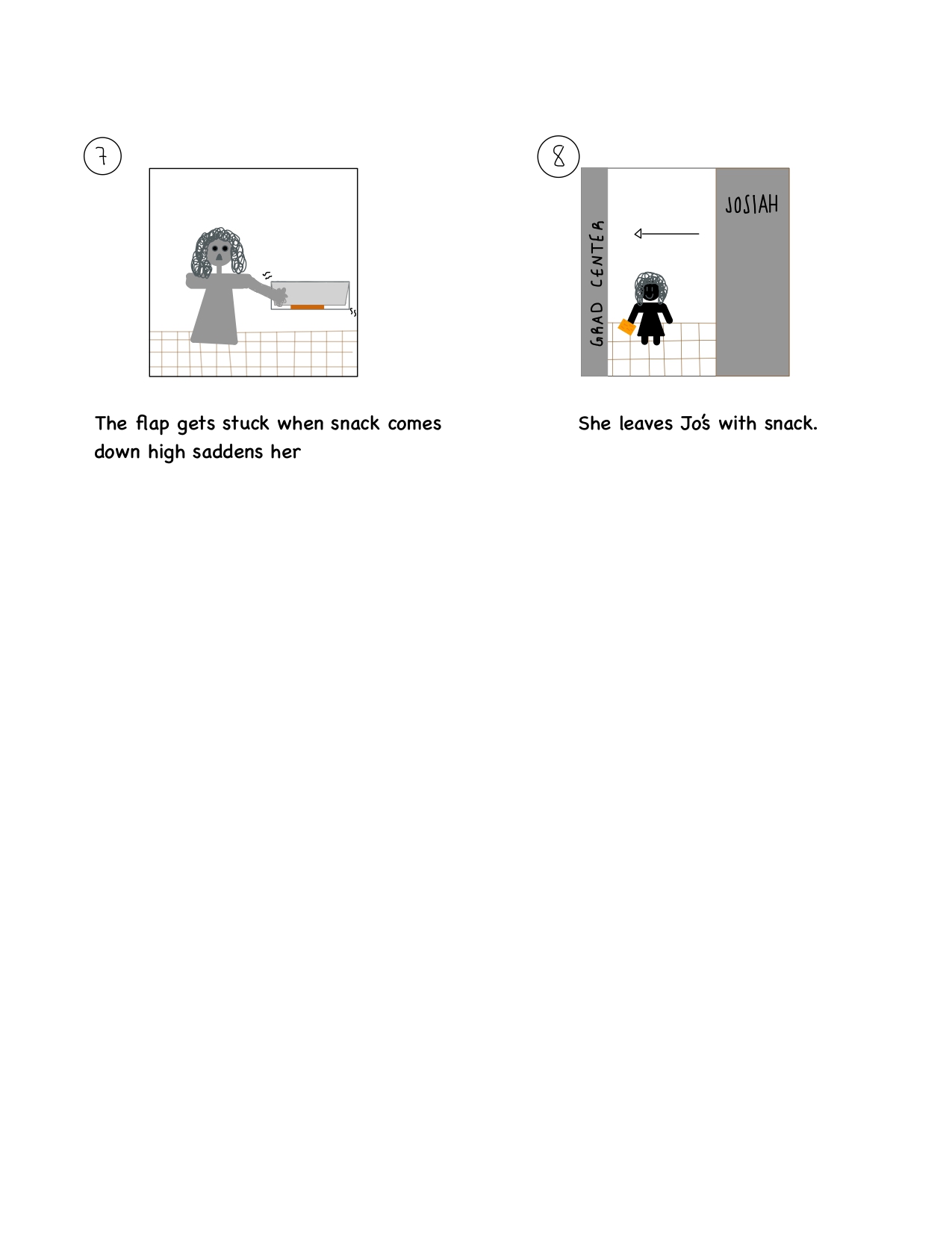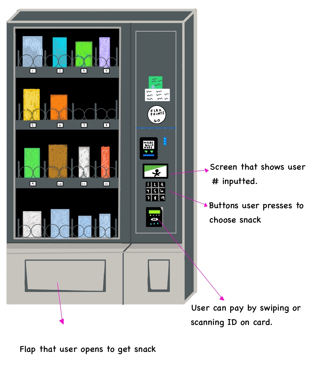 to indicate which snack they want. Afterwards, the user would need to bend down to get the snack from the flap found